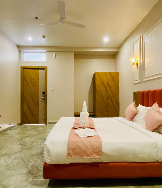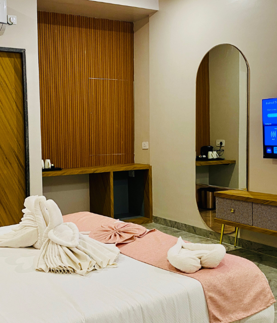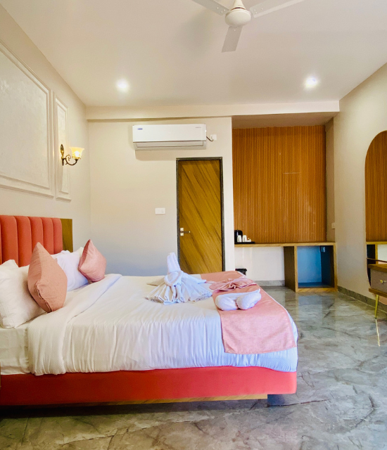 The Executive Room at Shree Anantay Club and Resort, Ujjain offers a sophisticated retreat for business and leisure travelers alike. With contemporary design and spacious interiors, it provides a blend of comfort and luxury. The room features a plush king-sized bed, a stylish work desk, high-speed internet, and a flat-screen TV, ensuring both relaxation and productivity. Guests can enjoy modern amenities like an elegant bathroom & a balcony. Whether for a restful stay or a business trip, the Executive Room provides a perfect environment for an elevated experience, combined with exceptional service and serene surroundings.